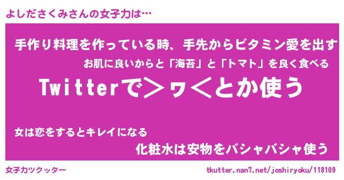 | ヒーロー風カッコイイあだ名 | 『スーパーヨシダサクミ』『魔戒騎士ヨシ』 |