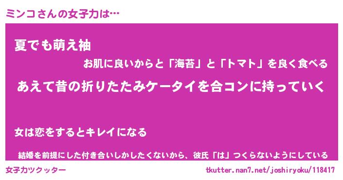 | ヘコむあだ名 | 『ミンもー』『酢こんぶ』『ミンっぺ』 |