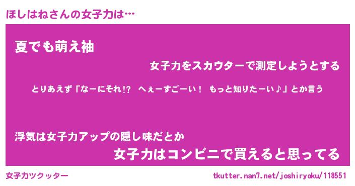 | ヘコむあだ名 | 『ほしにゅー』『なまこ酢』 |
