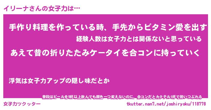 | ファンタジー風あだ名 | 『イリフェル』『エターナルイリーナー』 |