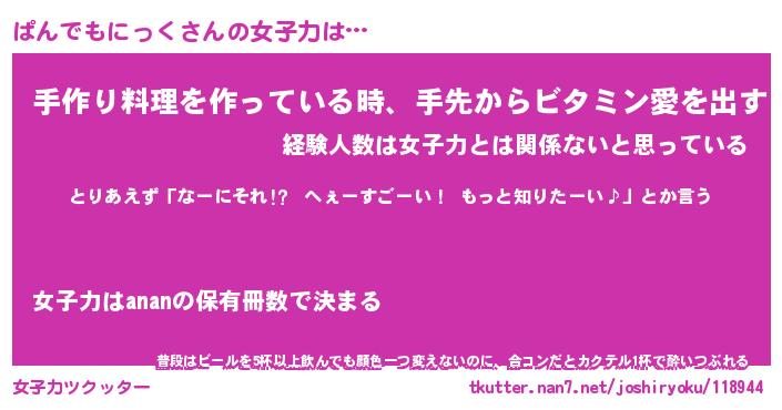 | 恥ずかしいあだ名 | 『プリティーぱんでもにっく』『ぱんちん』 |
