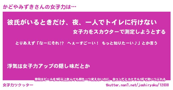 | 恥ずかしいあだ名 | 『プリティーかどやみずき』『かどっちょ』 |