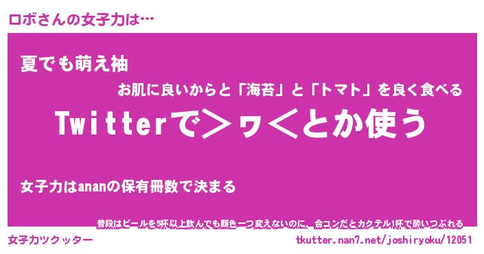 | ヘコむあだ名 | 『ロボにゅー』『なまこ酢』『ロボを』 |