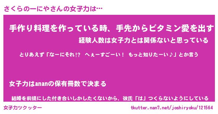 | ヘコむあだ名 | 『さくにー』『なまこ酢』『さく太郎』 |