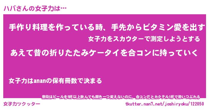 | ヘコむあだ名 | 『ハバふぇ~』『つくし』『ハバ太郎』 |