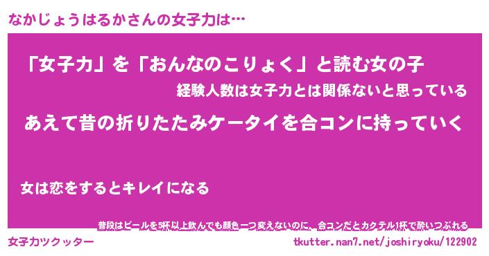 | 女子向けラノベタイトル風あだ名 | 『(仮)なかじょうはるかのやんごとなき事情』 |