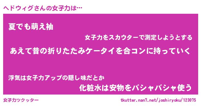 女子向けラノベタイトル風あだ名 | 『(仮)ヘドウィグのやんごとなき事情』 |