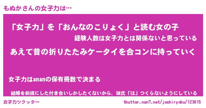 | 男性向けラノベタイトル風あだ名 | 『もぬかの憂鬱』 |