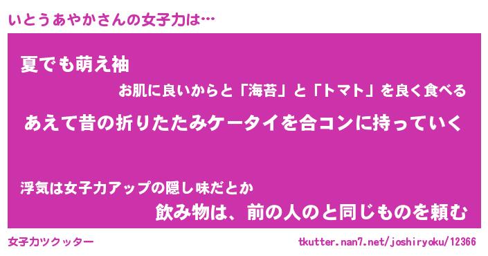 | 恥ずかしいあだ名 | 『プリティーいとうあやか』『いとっちょ』 |