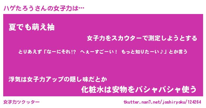 | ヘコむあだ名 | 『ハゲにゅー』『なまこ酢』『ハゲを』 |