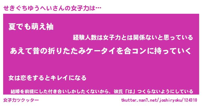 | ヘコむあだ名 | 『せきにゅー』『なまこ酢』『せきを』 |