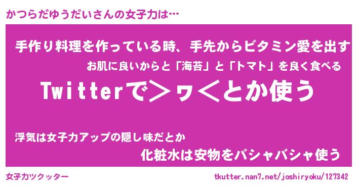 | ヘコむあだ名 | 『かつふぇ~』『酢こんぶ』『かつを』 |