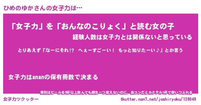 | 恥ずかしいあだ名 | 『プリティーひめのゆか』『ひめっちょ』 |