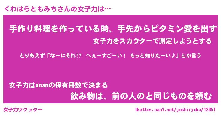 | 肩書あだ名 | 『くわはらともみち御曹司』 |