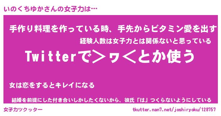 | ヒーロー風カッコイイあだ名 | 『スーパーイノクチユカ』『魔戒騎士イノ』 |