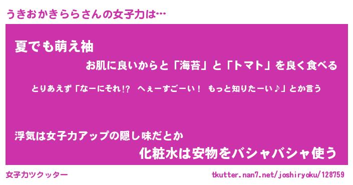 | 恥ずかしいあだ名 | 『プリティーうきおかきらら』『うきちん』 |