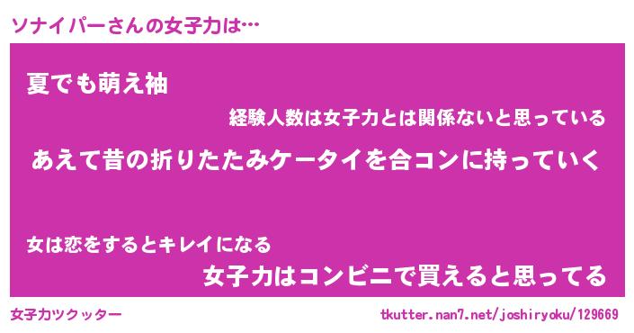 | ファンタジー風あだ名 | 『ソナフェル』『エターナルソナイパーー』 |