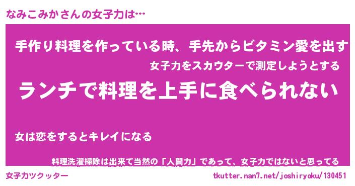 | ヒーロー風カッコイイあだ名 | 『スーパーナミコミカ』『幻影騎士ナミ』 |
