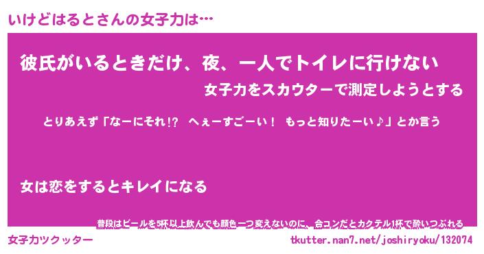 | ヘコむあだ名 | 『いけにー』『つくし』『いけお』 |