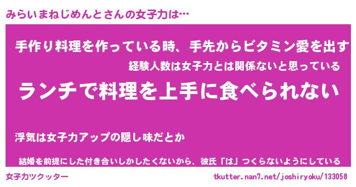 | ヘコむあだ名 | 『みらにー』『牛乳』『みらっぺ』 |