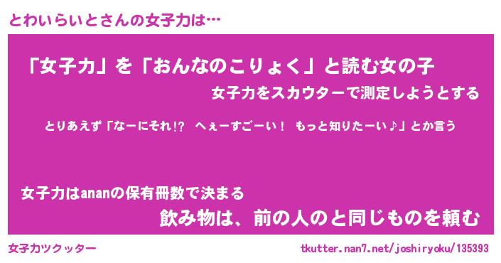 | ヘコむあだ名 | 『とわにー』『なまこ酢』『とわお』 |