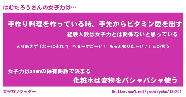 | ヘコむあだ名 | 『はむっふぃ~』『つくし』 |