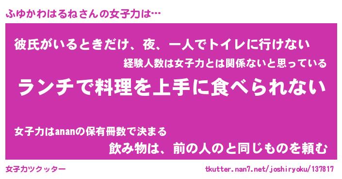 | 恥ずかしいあだ名 | 『プリティーふゆかわはるね』『ふゆちん』 |