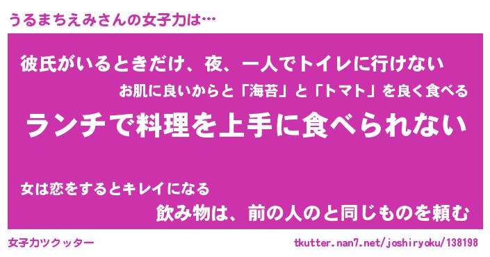 | ヘコむあだ名 | 『うるもー』『豆乳』『うる太郎』 |