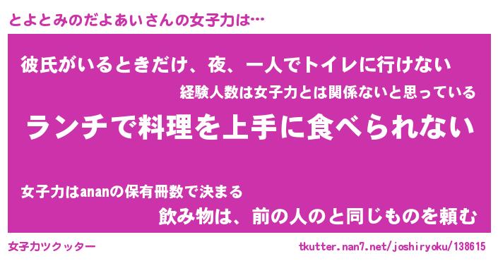 | ヘコむあだ名 | 『とよっふぃ~』『つくし』 |