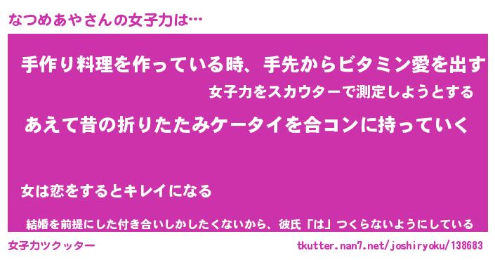 | ファンタジー風あだ名 | 『ナツフェル』『エターナルナツメアヤー』 |