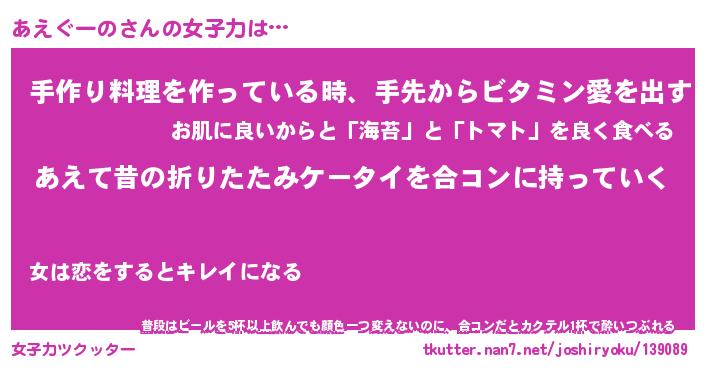| ヘコむあだ名 | 『あえふぇ~』『つくし』 |