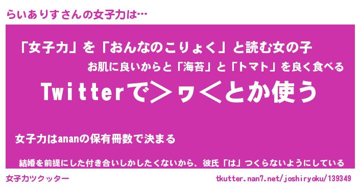 | 肩書あだ名 | 『らいありす社長令嬢』『らいありす塾長』 |