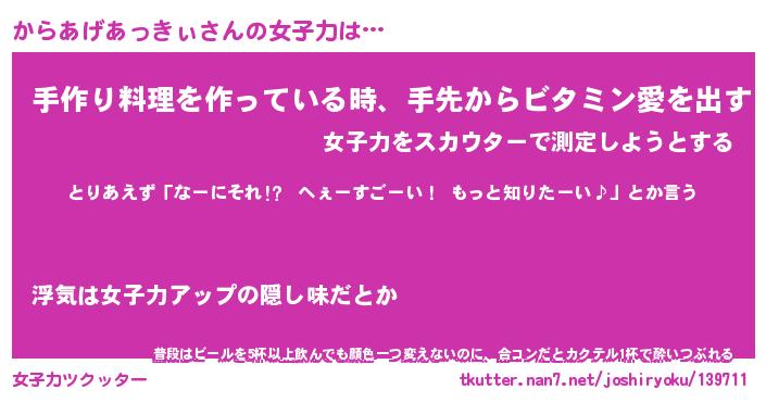 | ツイッター | からあげあっきぃさんのツイッターID『katatsumuri_star』 |