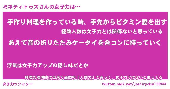 | ヘコむあだ名 | 『ミネにー』『牛乳』『ミネ太郎』 |