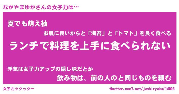 | 恥ずかしいあだ名 | 『プリティーなかやまゆか』『なかっちょ』 |