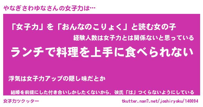 | 女子向けラノベタイトル風あだ名 | 『誰かこのやなぎさわゆなを説明してください! ~契約から始まるウェディング~』 |