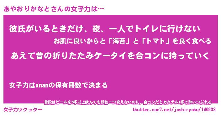 | 恥ずかしいあだ名 | 『プリティーあやおりかなと』『あやちん』 |