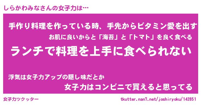 | 恥ずかしいあだ名 | 『プリティーしらかわみな』『しらっちょ』 |