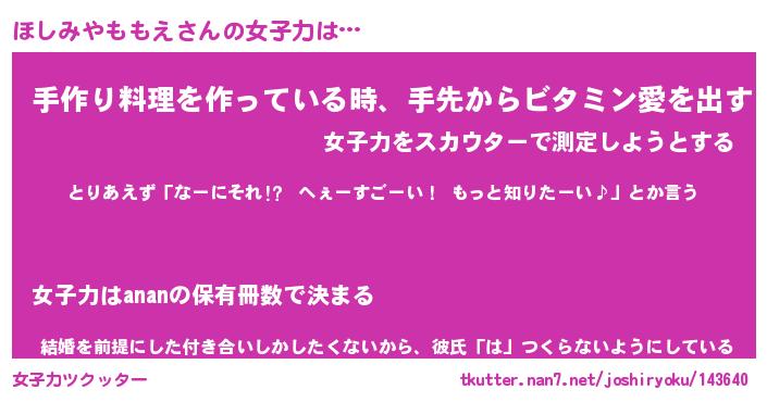 | 胡散臭い通販商品みたいなあだ名 | 『モテモテ間違いなしブレスレット…その名も「ほしみやももえ」』 |