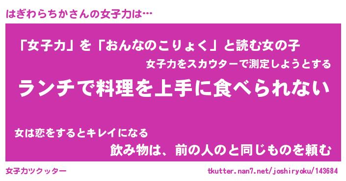 | 恥ずかしいあだ名 | 『プリティーはぎわらちか』『はぎっちょ』 |