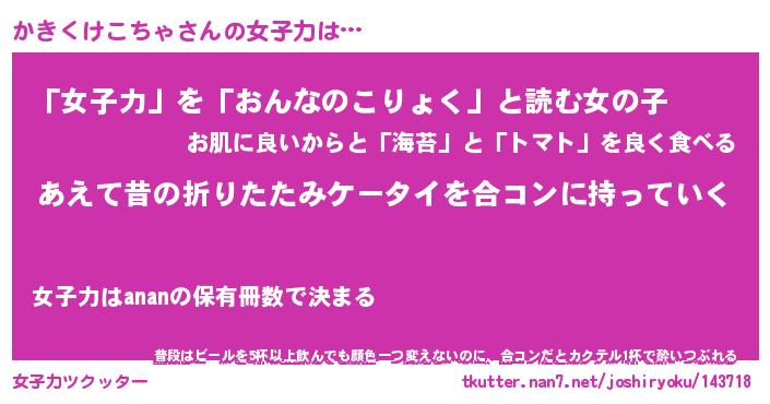 | 男性向けラノベタイトル風あだ名 | 『かきくけこちゃの憂鬱』 |