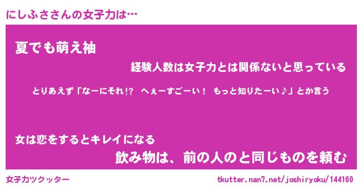 | ヘコむあだ名 | 『にしにゅー』『なまこ酢』 |