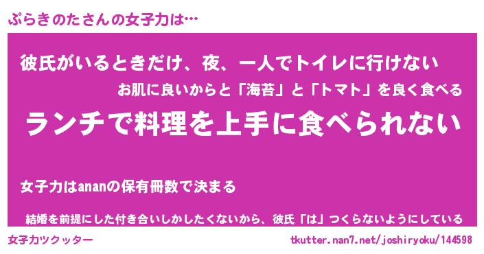 | ヘコむあだ名 | 『ぷらにゅー』『つくし』『ぷらっ子』 |