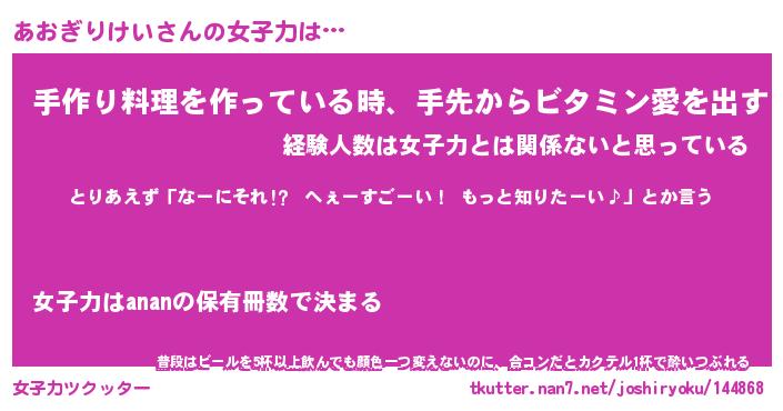 | 恥ずかしいあだ名 | 『プリティーあおぎりけい』『あおっちょ』 |