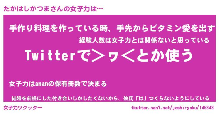 | 恥ずかしいあだ名 | 『プリティーたかはしかつま』『たかちん』 |