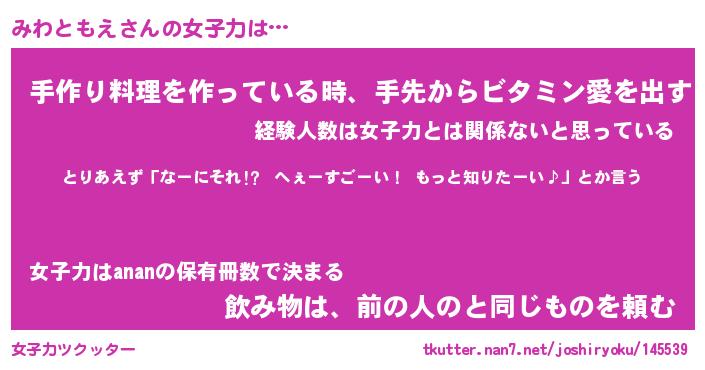 | ファンタジー風あだ名 | 『ミワフェル』『エターナルミワトモエー』 |