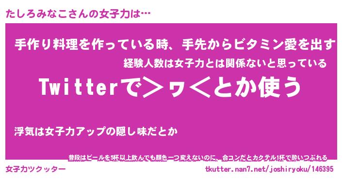 | 恥ずかしいあだ名 | 『プリティーたしろみなこ』『たしっちょ』 |
