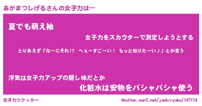 | ツイッター | あかまつしげるさんのツイッターID『dendenmushi_idle』 |