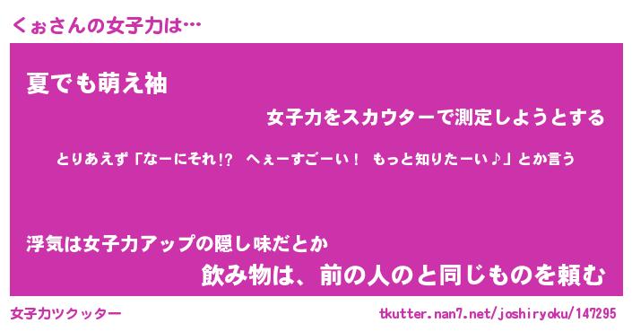 | ヘコむあだ名 | 『くぉにゅー』『なまこ酢』『くぉを』 |
