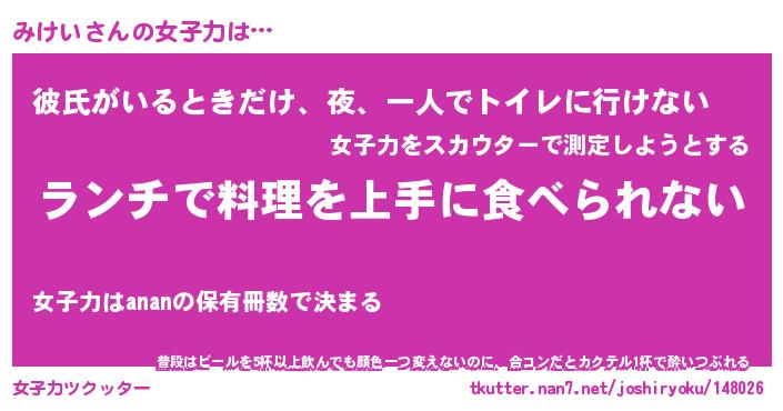 | ヘコむあだ名 | 『みけっふぃ~』『牛乳』『みけ太郎』 |